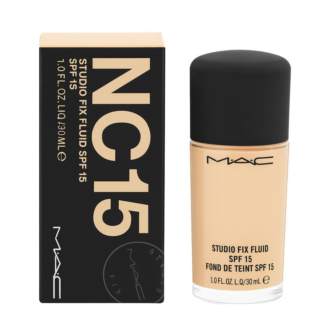 Mac NC15 Studio Fix Fluid SPF 15 (30ml) provides medium-to-full coverage for fair to light skin tones, creating a smooth, even complexion with a natural matte finish. The liquid formula blends effortlessly for a polished, professional look.